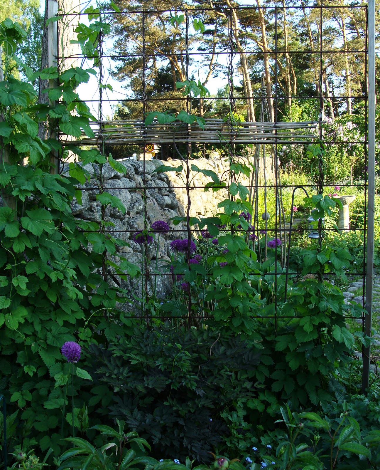 Armeringsjärn är billigt och lätt att jobba med. Det rostiga står sig vackert mot det gröna bladverket.