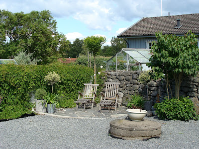 Direkt till vänster (syns ej på bilden) har vi byggt ett plank, för att skapa en sk innergård framför huset. Än så länge ligger här bara grus. Planen är att bygga en glasveranda och sedan bygga ett stort trädäck i kombination med stenläggning. Det blir som ett extra vardagsrum om sommaren. Härligt när funktion möter form och karaktär! Lilla medelhavet finns som synes kvar här, dock omgivet av grus numera. Till nästa år får den lilla platsen flytta på sig…. Försöker piffa till grusöknen med lite krukor och annat krafs 🙂 Har ju lovat och visa ritningen…den kommer.