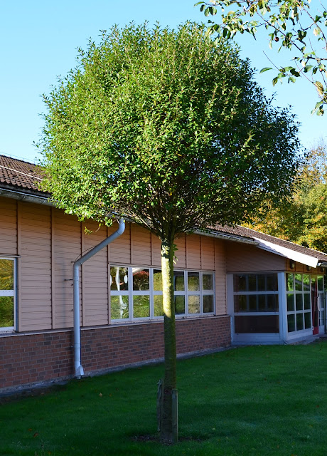 Gick förbi sonens förskola och knäppte denna bild. Det är en gigantisk silverpil var bladverk fortfarande till stor del sitter kvar. Konstigt kan man ju tycka eftersom mer eller mindre alla andra träd fällt sin löv. Att silverbladiga växter behåller sina löv längre än andra växter beror helt enkelt på att de har mindre klorofyll. Så vill man ha ett träd eller buske som är lövat länge satsa på något grå/silverbladigt!