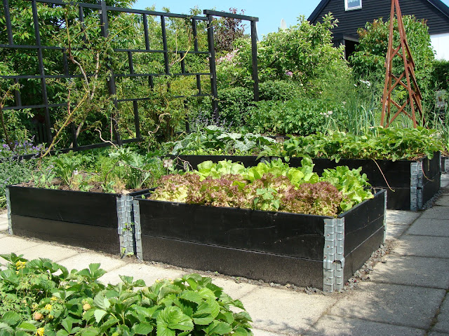 Lättskött och lättodlat är det i pallkragar. Här har ytan fått en vägg i form av spaljé vilket ger rumskänsla. Plattor runt kragarna gör det snyggt och ogräsbekämpning här existerar inte.