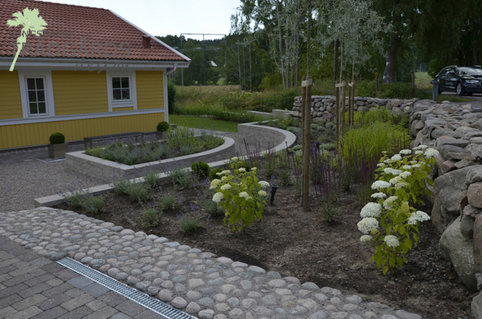 Önskemålet var mindre gräsmatta, mer blomning och väldigt lättskött. Här ger upphöjda och formstarka planteringsbäddar vackra blickfång.