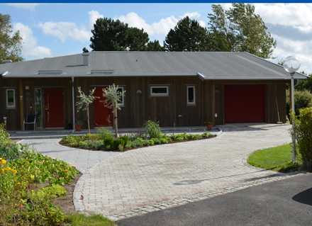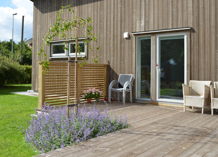 Tomtens läge och beskaffenhet gör körsträckan/infarten lång. Den stora utmaningen i detta uppdraget var att ta bort känslan av stenöken på framsidan samt att få till en bra lösning på nivåskillnaderna.